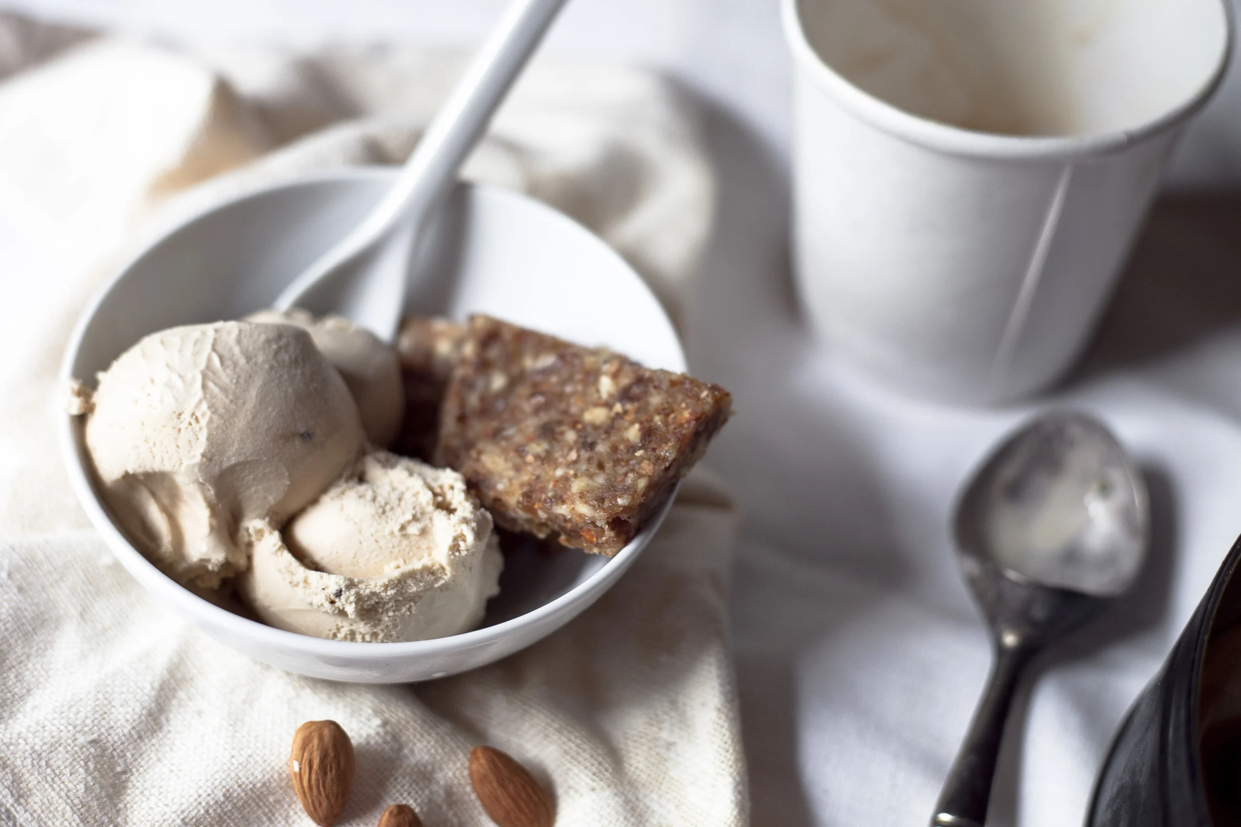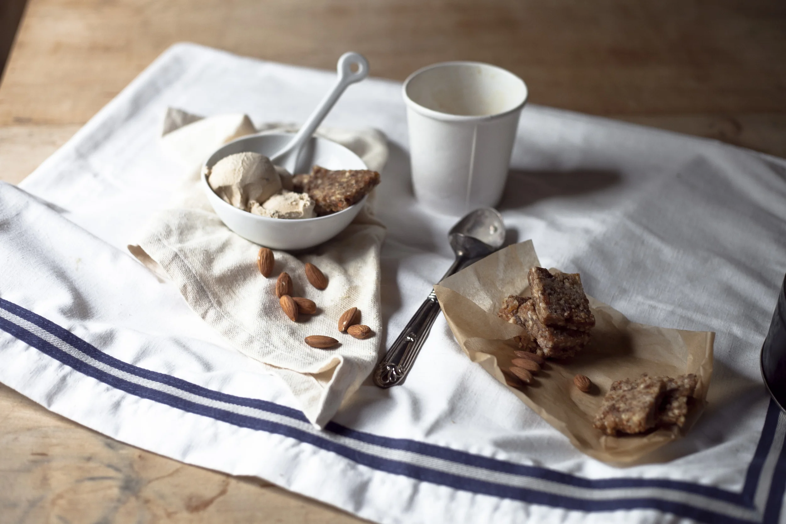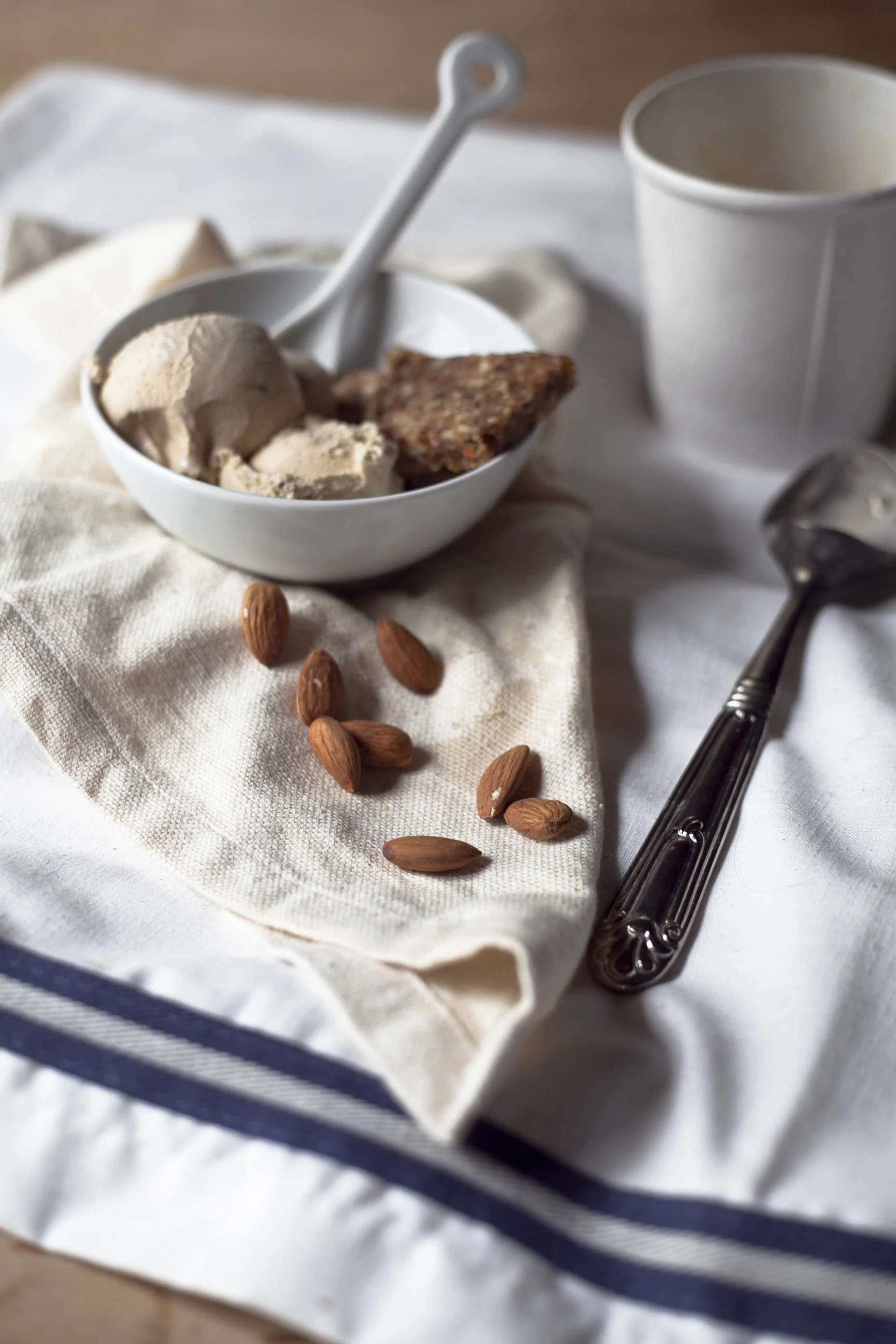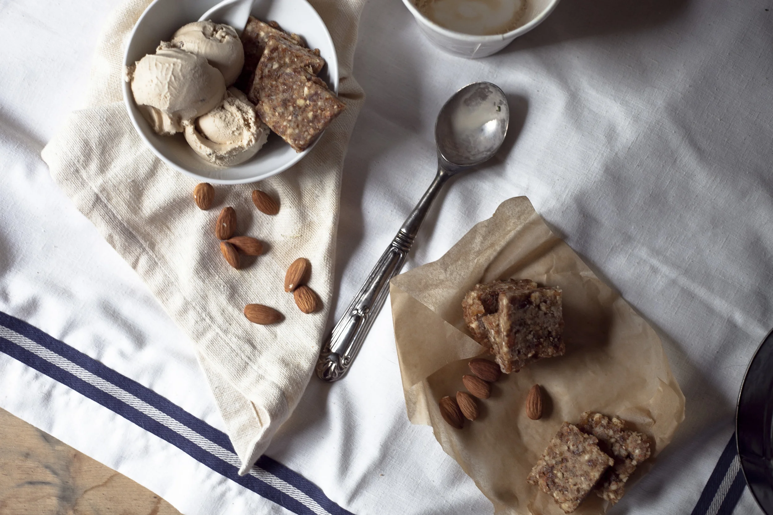 /// Directions /// In a food processor, add dates and almonds and water. Holding the lid down and pressing to stabilize on the counter, pulse the date mix. Keep pulsing until the ingredients become chopped and start to ball together. They should look large and grainy as they come together. Add spices and pulse again. Using a rubber spatula, turn mix out onto a pan with a Silpat or parchment paper. Pat into a square and place in the freezer for 30 minutes. Cut into bars and store in a container in the freezer.