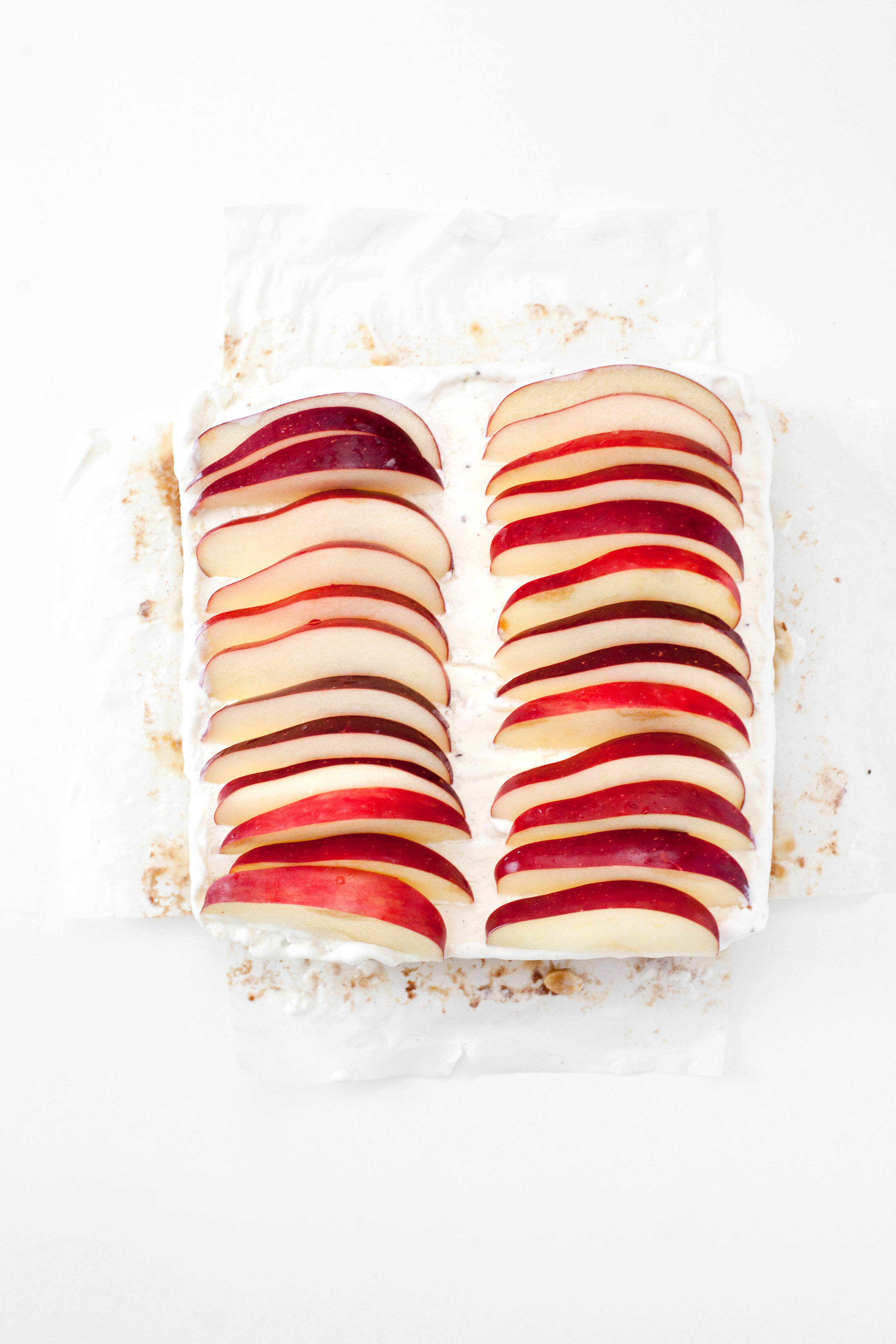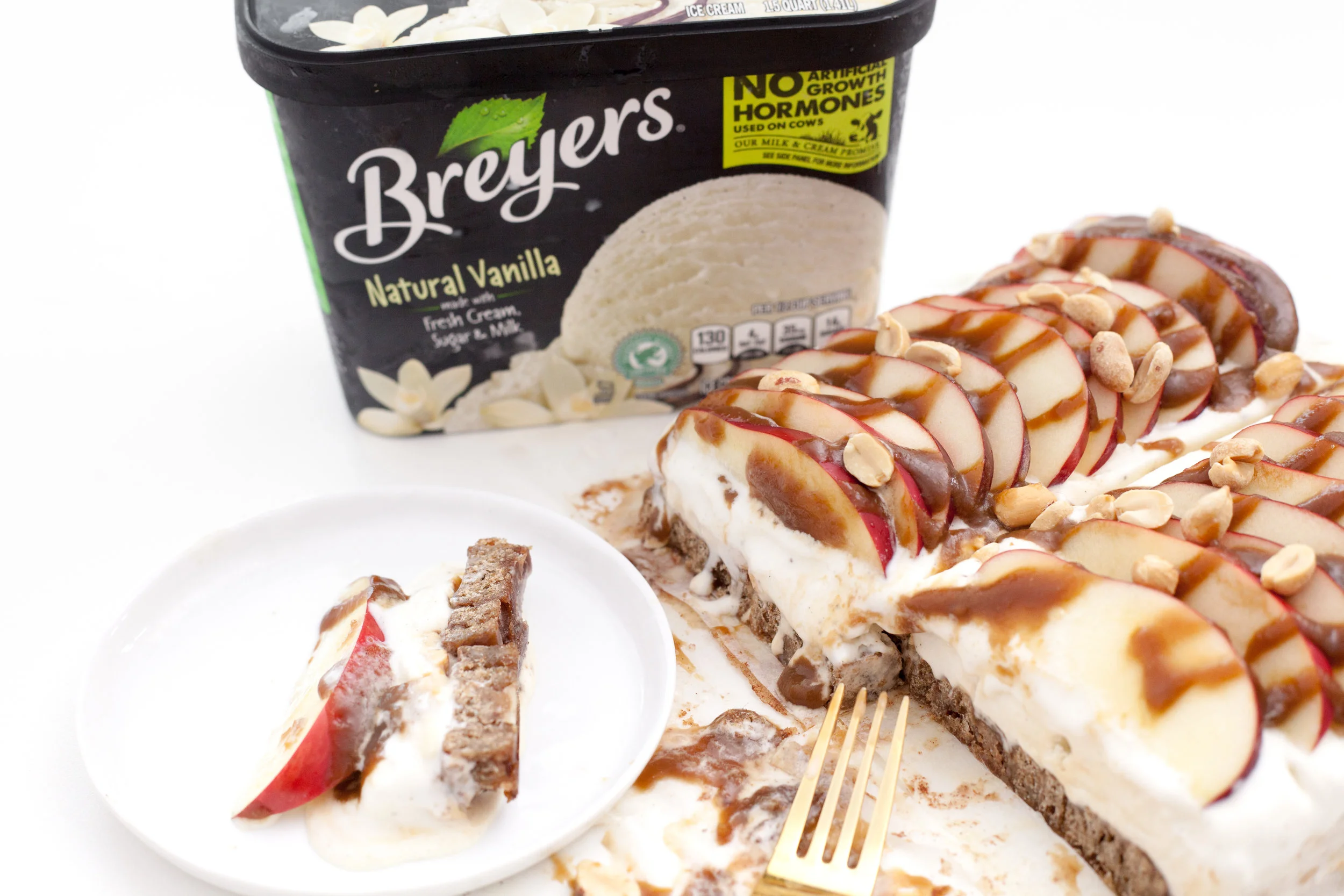 So what do you say? Should we play with ice cream? Don’t worry…hand scoop smoothing not required. This recipe is for an ice cream slab cake. The base is made from whole wheat and buckwheat cinnamon rolls (I KNOW!). The middle is Breyers® Natural Vanilla and it’s topped with fresh apples, salted peanuts and caramel.