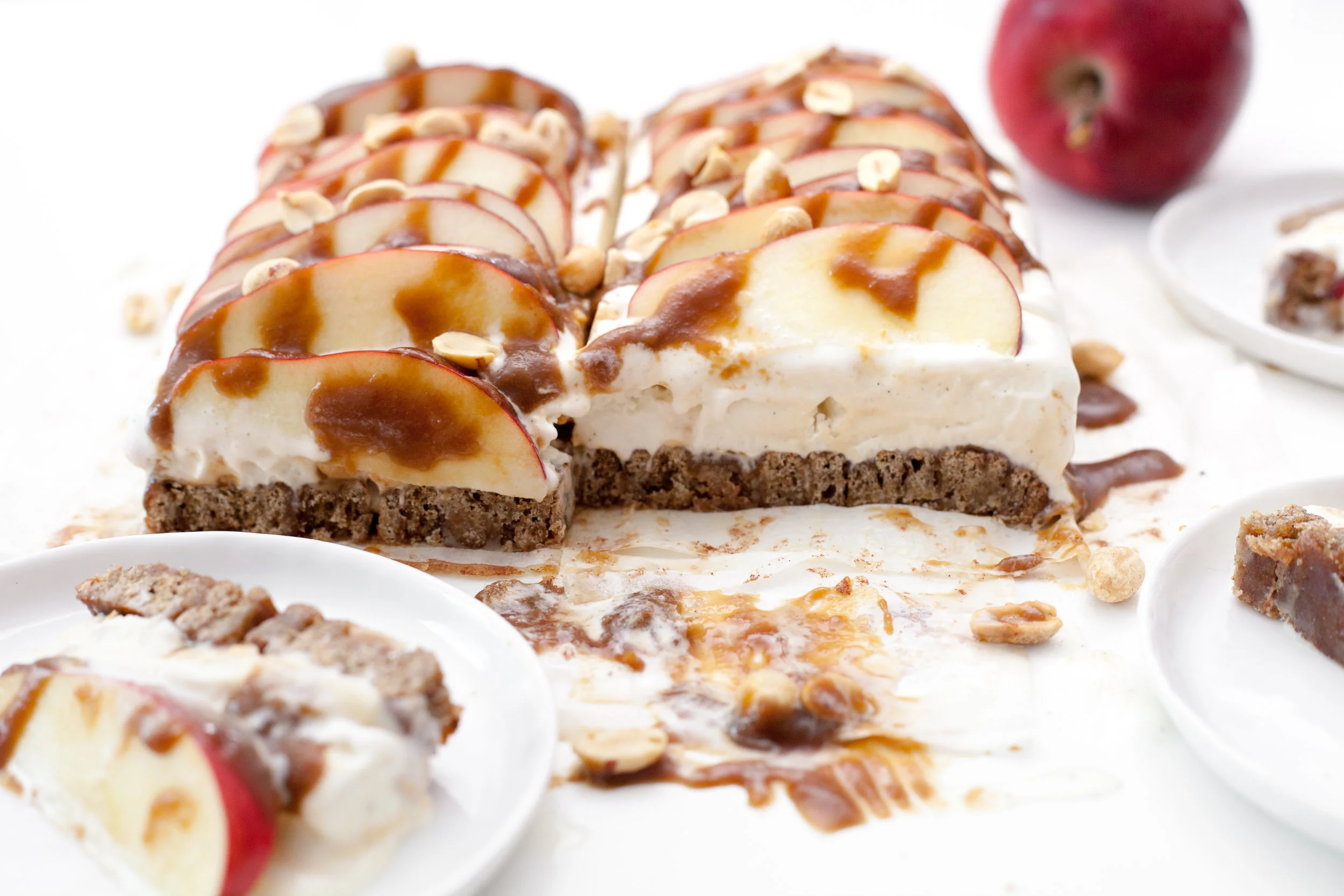 Slice apple thinly. To keep from browning, toss in a mix of lemon juice and water. Remove cake from freezer and arrange apples on top in two overlapping rows. Top with peanuts and caramel drizzle. Slice into 12 pieces and serve immediately. Store additional cake in freezer, wrapped with aluminum foil.