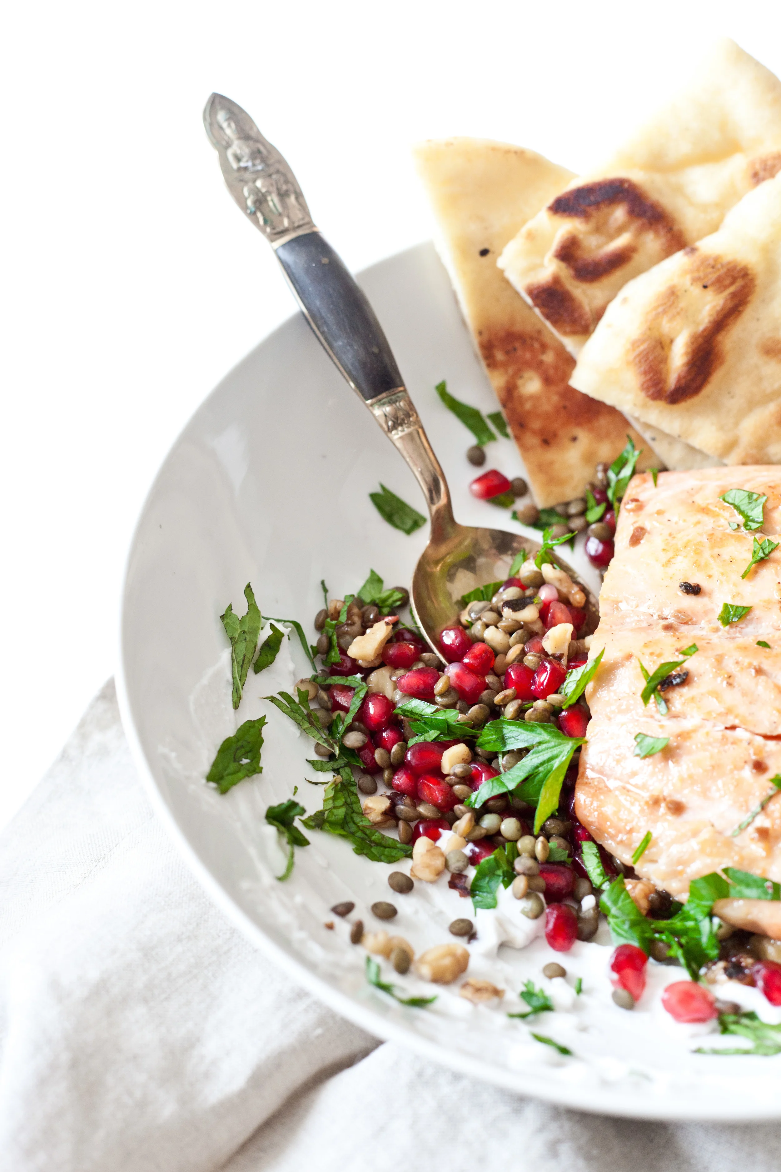 So while I could give you a ton of recipes for pulses (and you can see a few of my favorites I've created over the years for lentils and beans ), we're going to focus on something new we whipped up for you: Miso Salmon with a lentil, pomegranate and walnut salsa with flatbread and fresh herbs. Now if you're not into the fish in the dish, by all means skip it! This lentil pomegranate salsa can stand alone, as an add in to greens or with chicken. We're all about accommodating, so just make a few swaps by creating a miso dressing for the salad or chicken. Easy (dried) peasy.