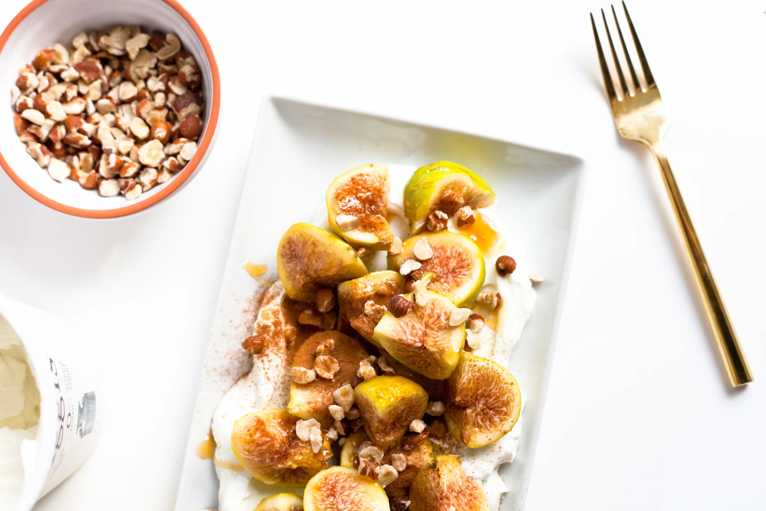 /// Directions /// Spread yogurt over the plate. Add quartered figs and top with hazelnuts, cinnamon and honey.