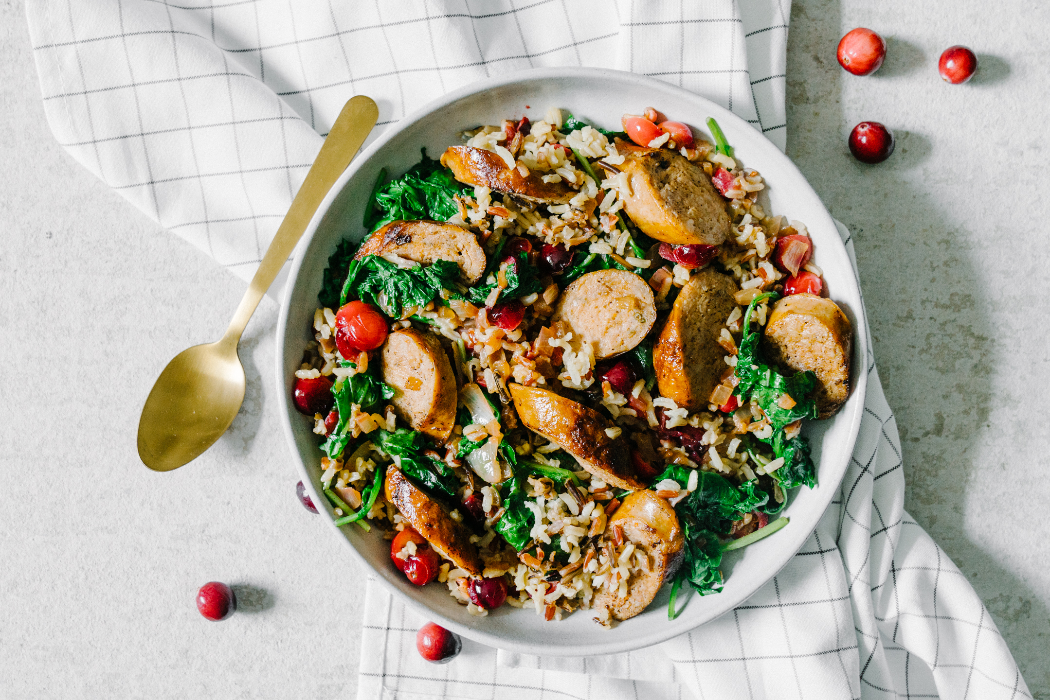 A balanced bowl of comfort with wild rice, kale, sausage and bright fresh cranberries