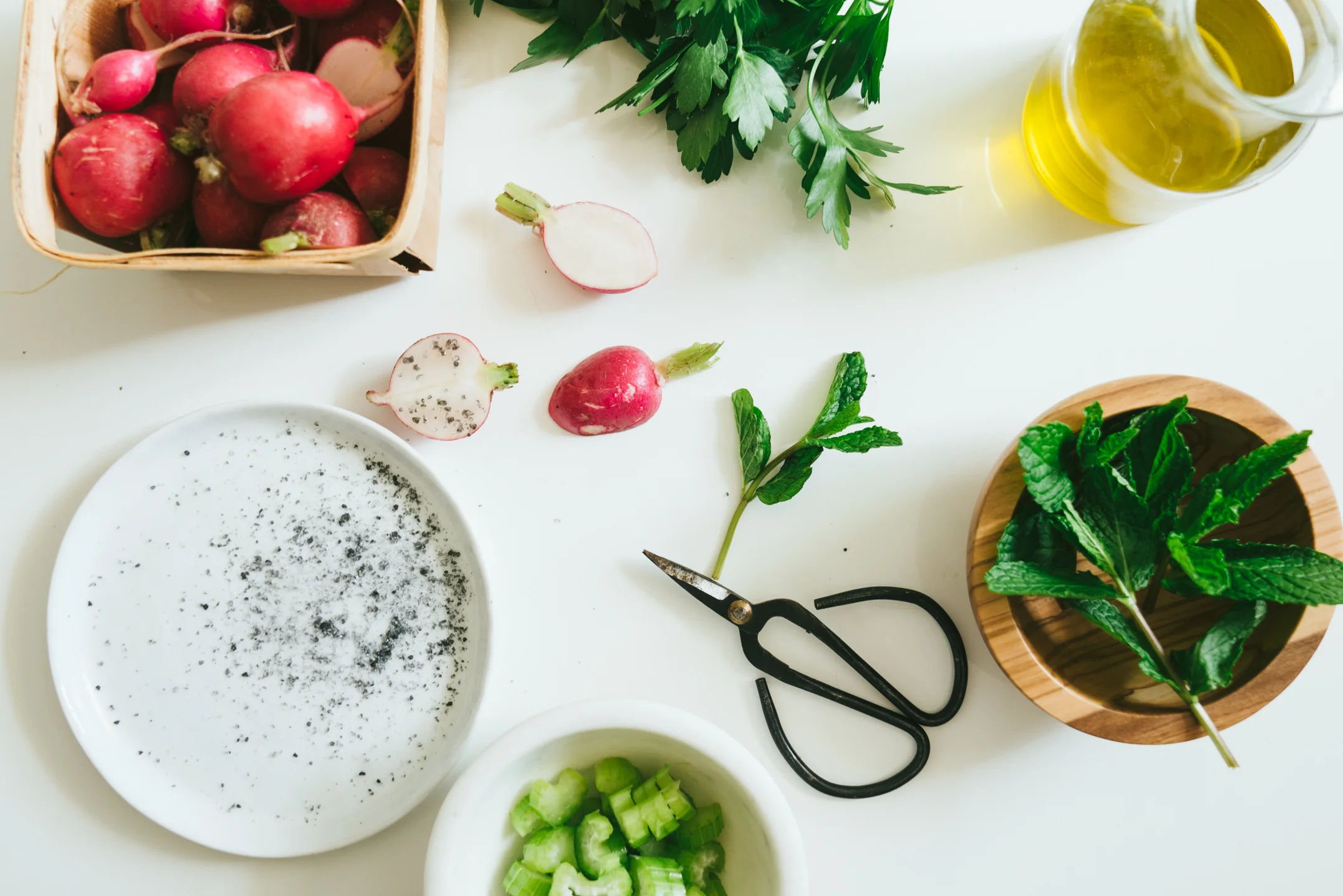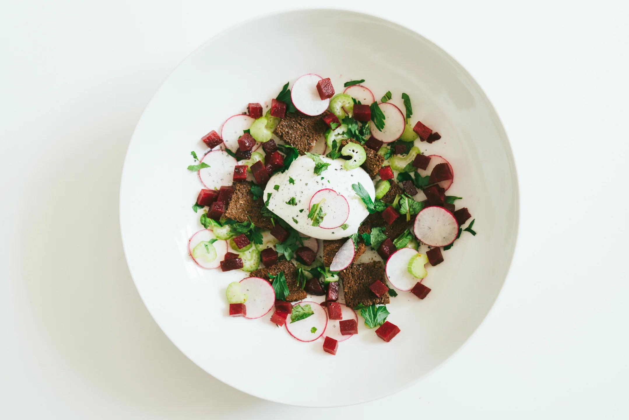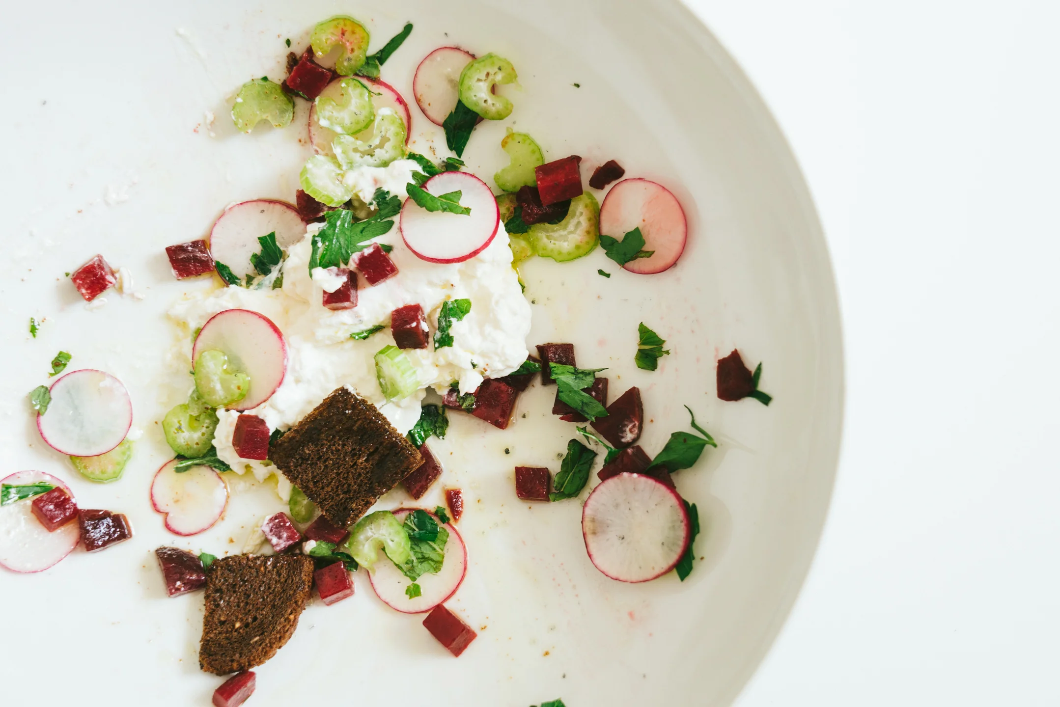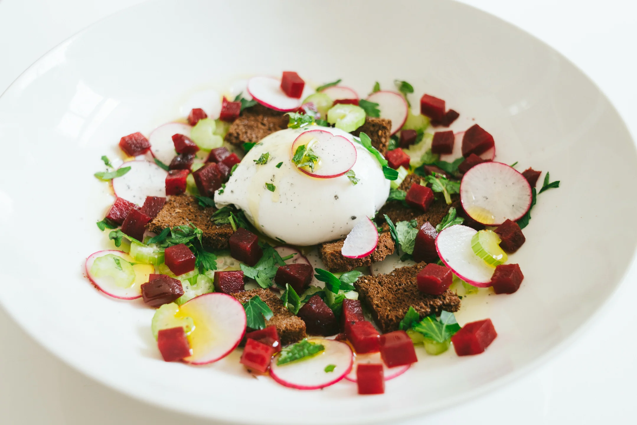 With today's burrata based salad we're going with two root vegetables: beets and radishes. Talk about different flavor profiles... Beets are very sweet and earthy while radishes are crisp and peppery. We're also pairing it with a dark rye pumpernickel bread as well as mint and parsley for freshness. If you wanted to make this recipe in another way, you could turn these into toasts: crisp rye bread with a slathering of burrata topped with herbs, black sea salt and sliced beets and radishes.