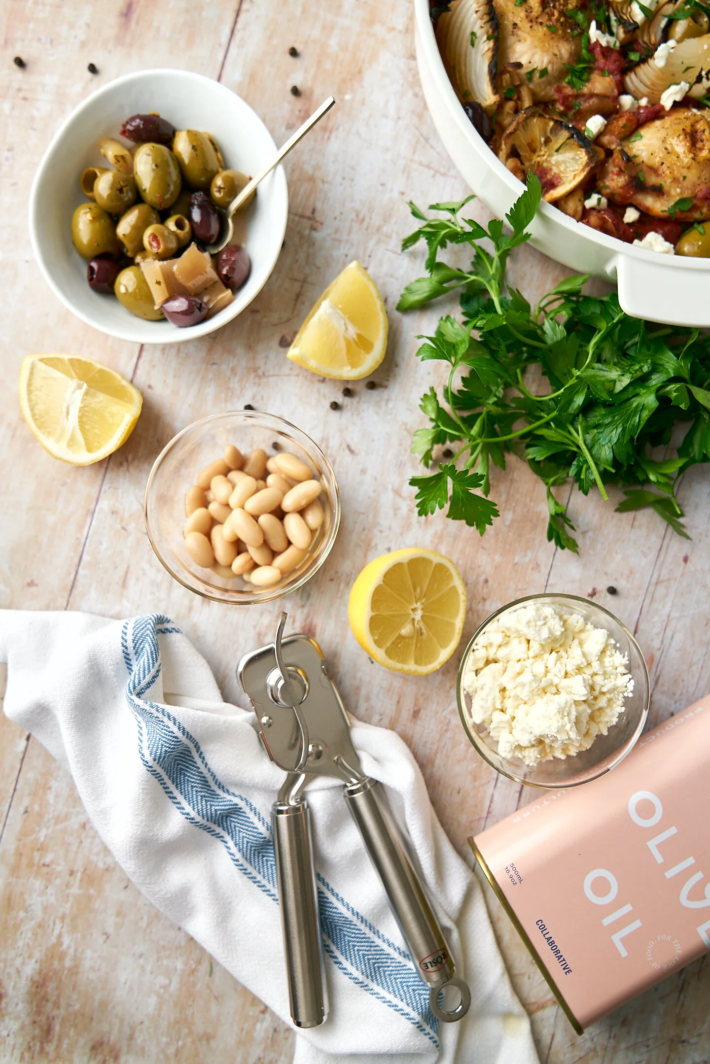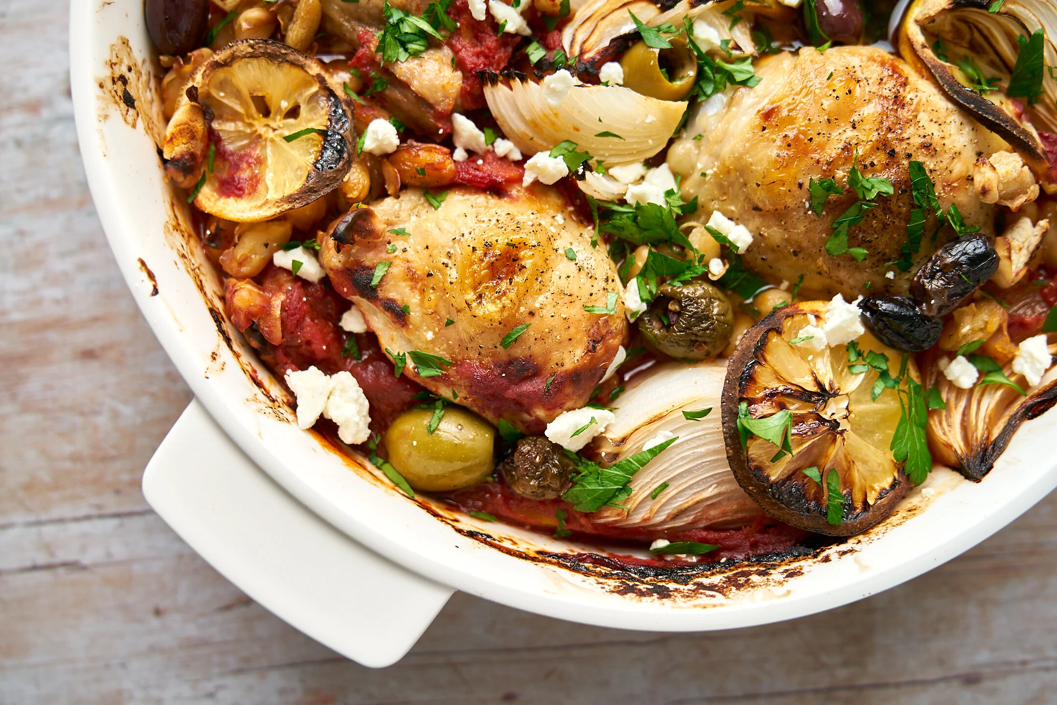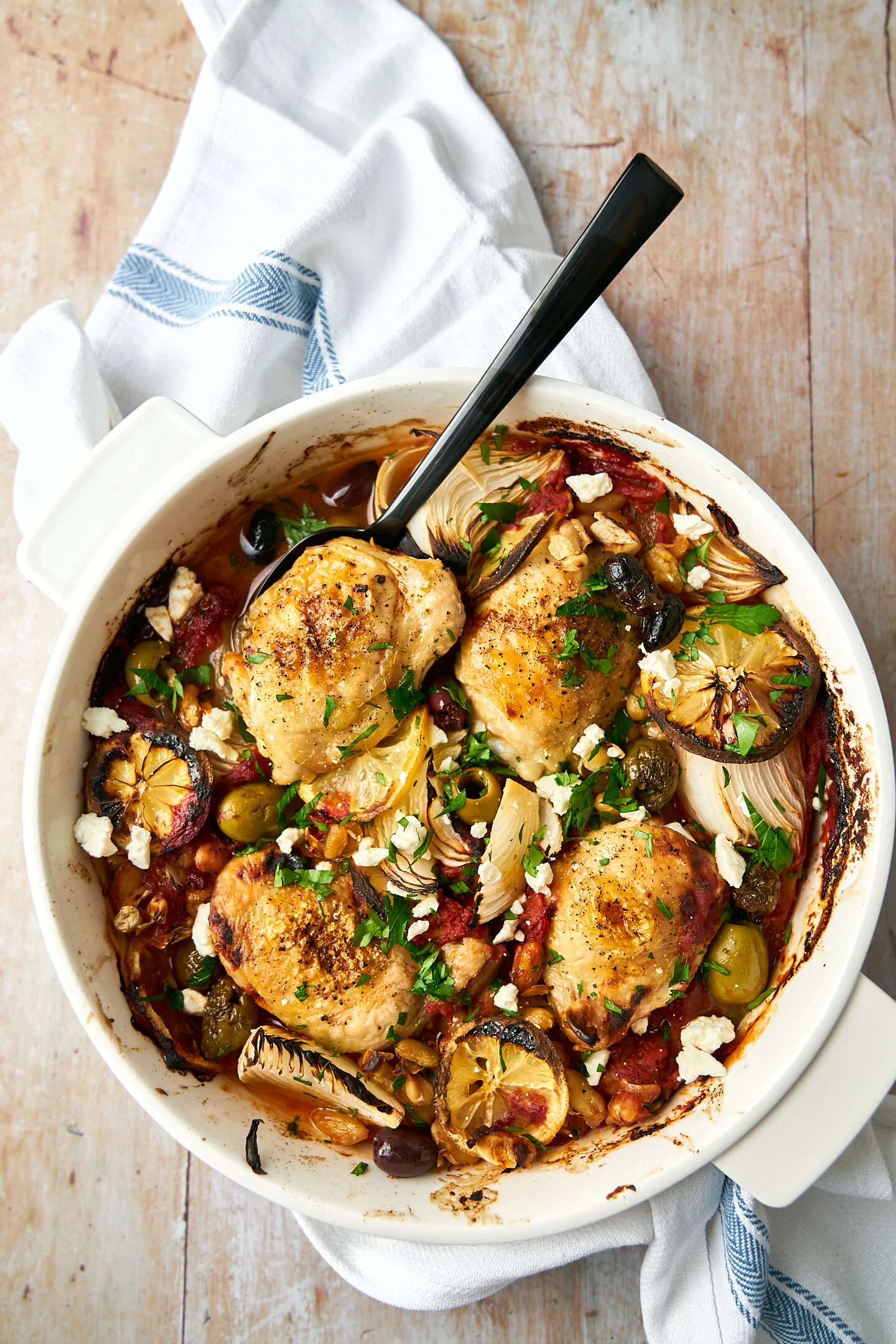 A healthy one pot meal featuring inexpensive ingredients like chicken thighs, canned tomatoes, onions and big flavor items you only need a sprinkle of like feta, olives, and herbs.