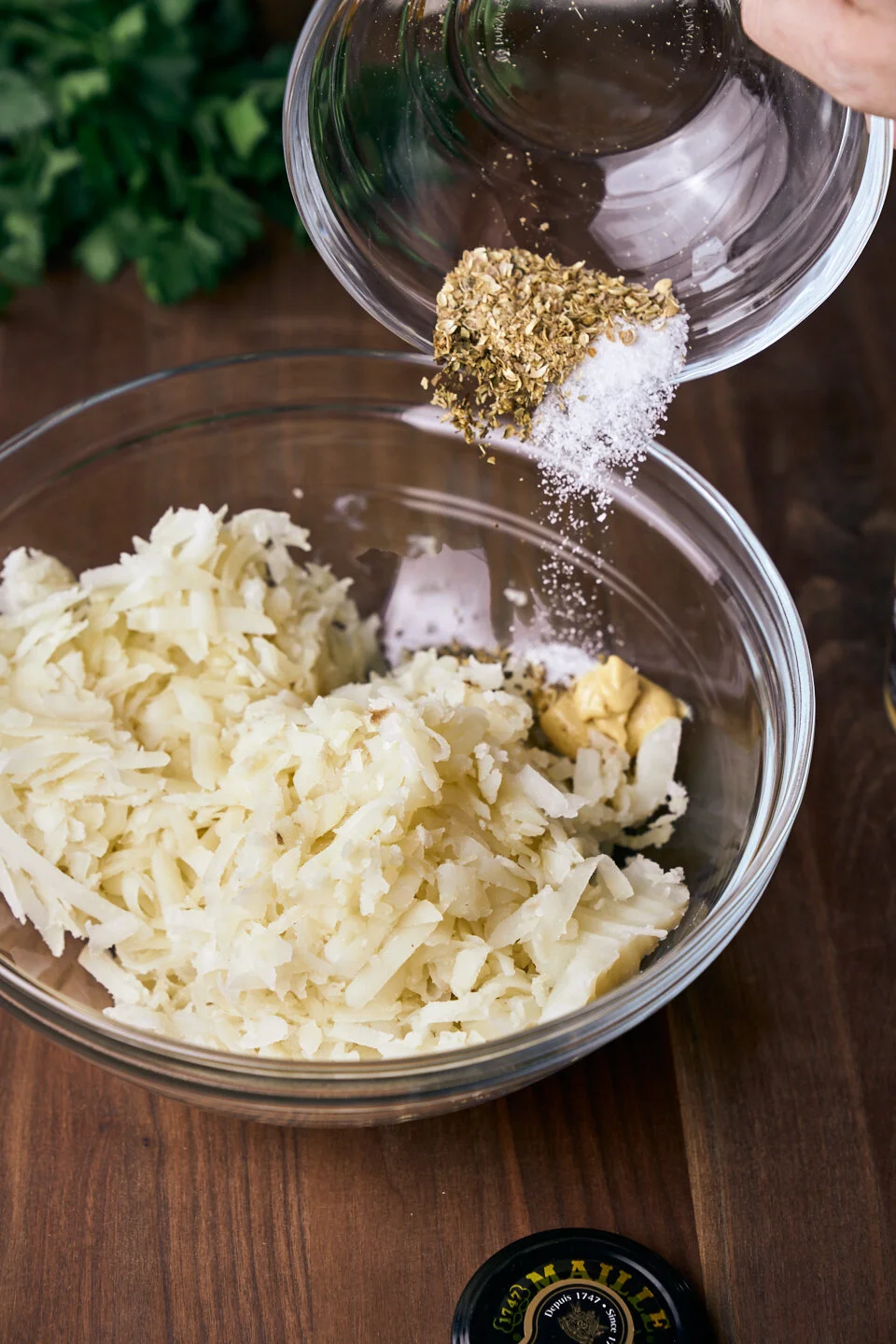 In a bowl mash potato, mustard, and seasonings with your hands. Mix well, smashing until soft and combined. Do this while the potato mix is lightly warm as it will be easiest to ‘mash’.