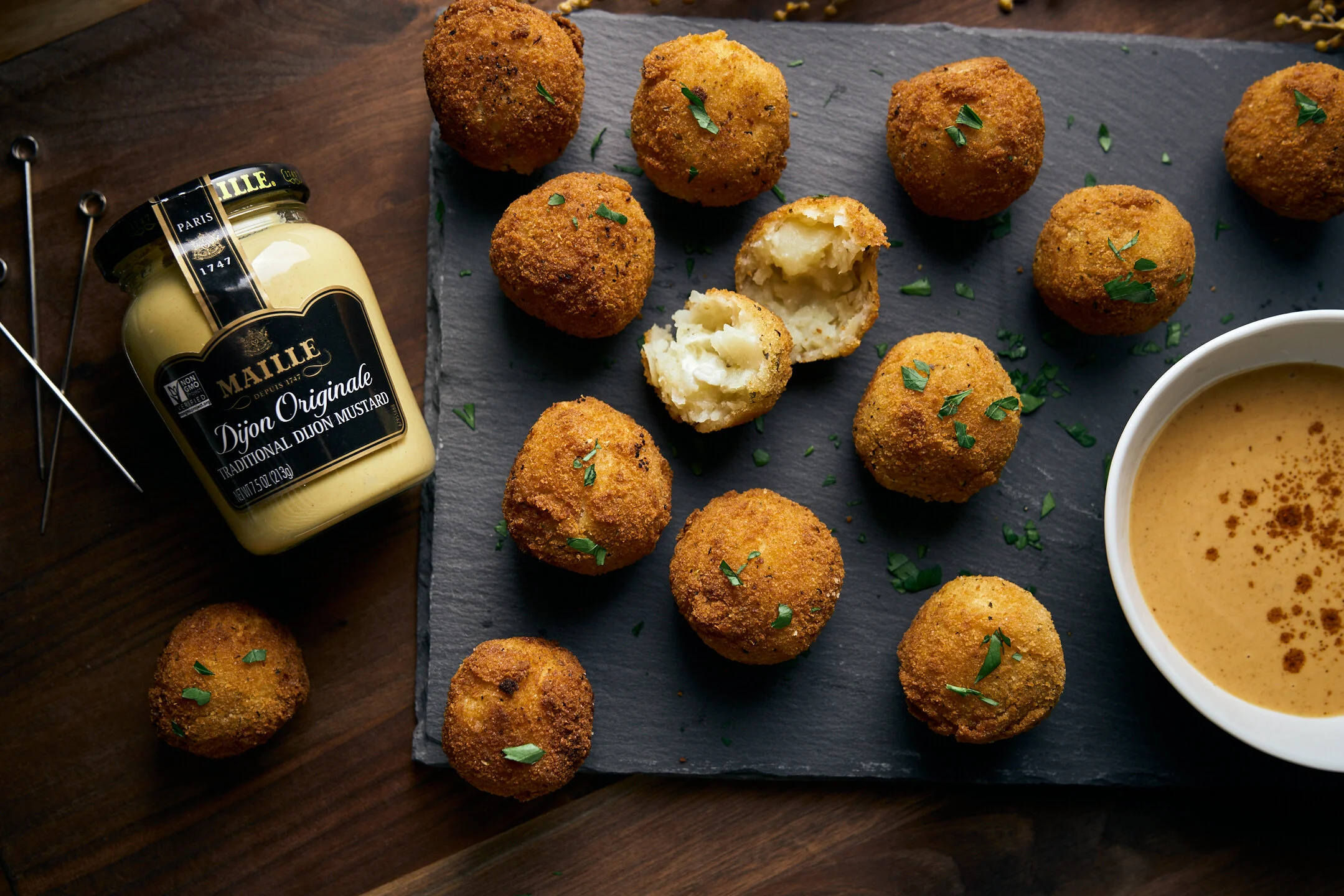 Whether you’re celebrating the holidays virtually, or with your household, or even solo, these potato bites are impressive, but simple enough not to stress over. You can find everything on the ingredient list really easily (which is saying something these days with pandemic shopping). Maybe the most surprising thing is how these basic ingredients come together to make something so different. Mustard has always been one of our go-to ingredients for everything from dressings and sauces to unexpected savory mix-ins. The tang cuts through any foods that are bland or maybe a bit higher in fat (hello fried potatoes!). The other big upside to this recipe is that if you’re terrible at planning, it’s also a good way to use up leftover mashed potatoes the next day (although the texture will be a bit different).