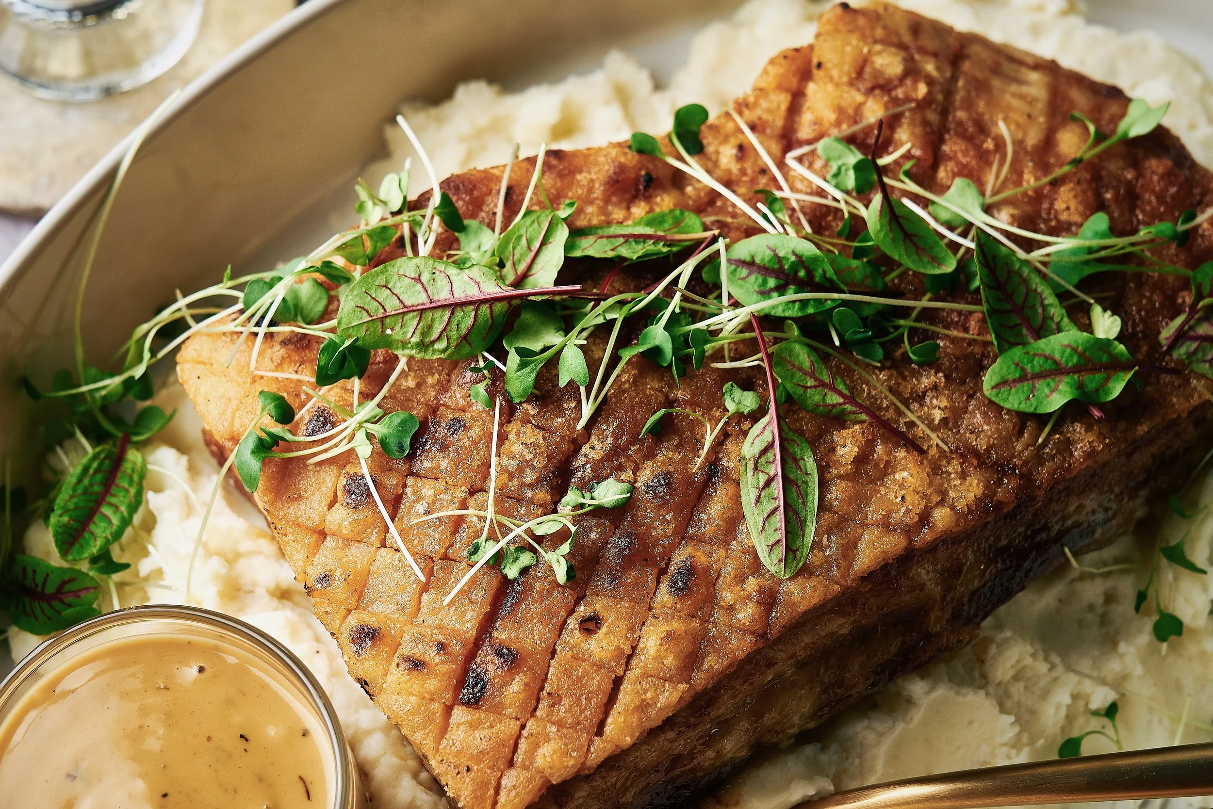 To plate, place pork belly skin side up on mashed potatoes and serve with sauce from the pan. Garnish with micro greens.