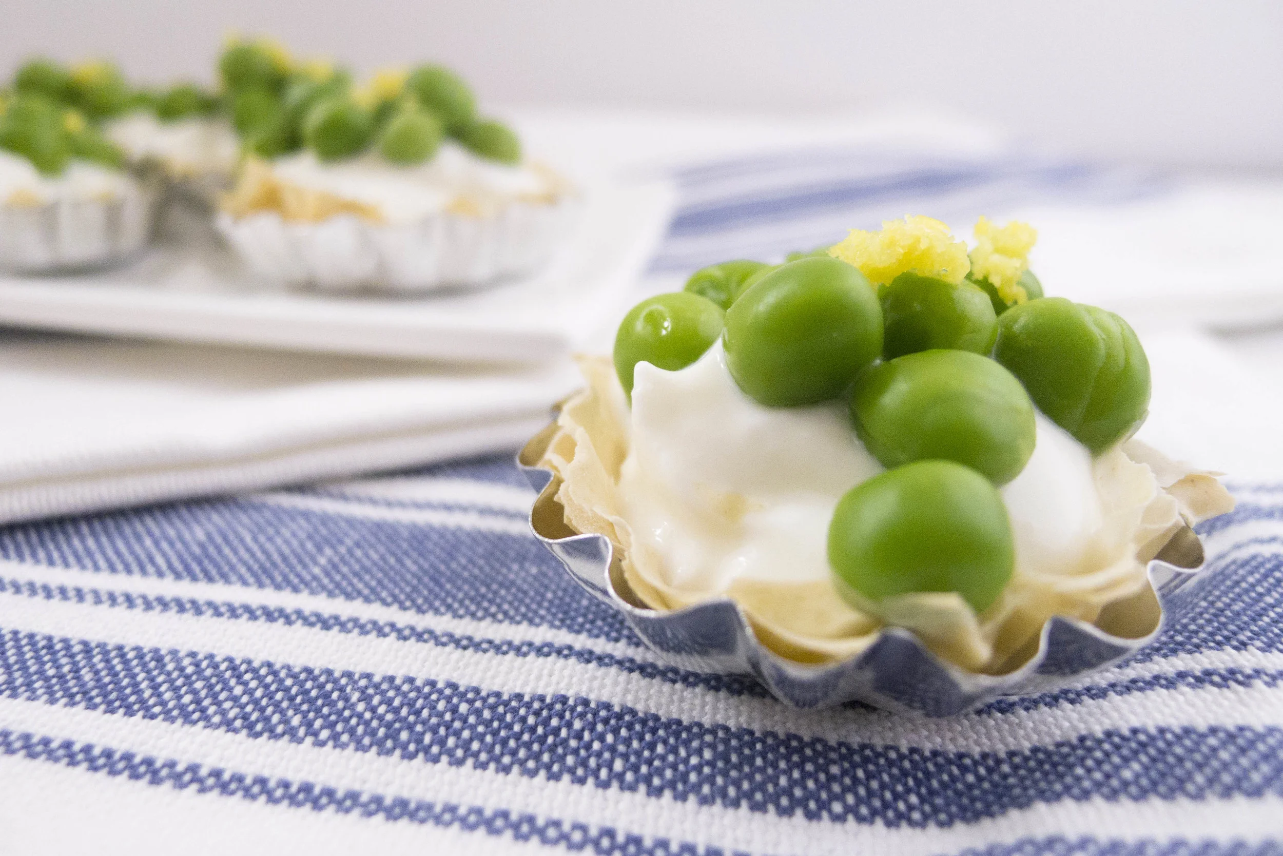Directions: Layer phyllo and butter and place into individual mini tarts. Bake per package directions. Whip goat cheese and Greek yogurt together with a hand mixer or in a standing mixer. Pipe into the mini tarts and top with blanched fresh spring peas. Zest a lemon over the top of all mini tarts and sprinkle with sea salt.